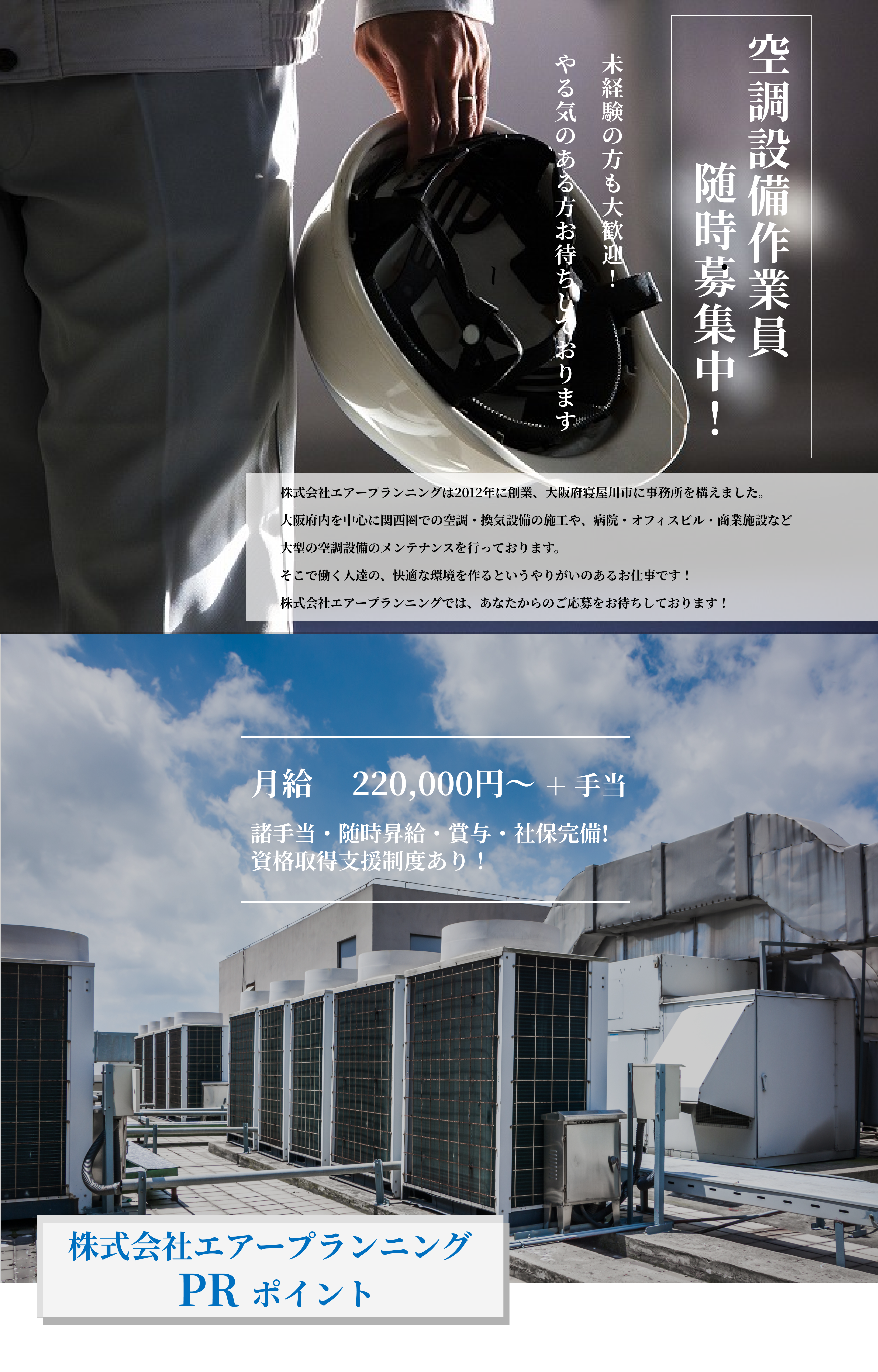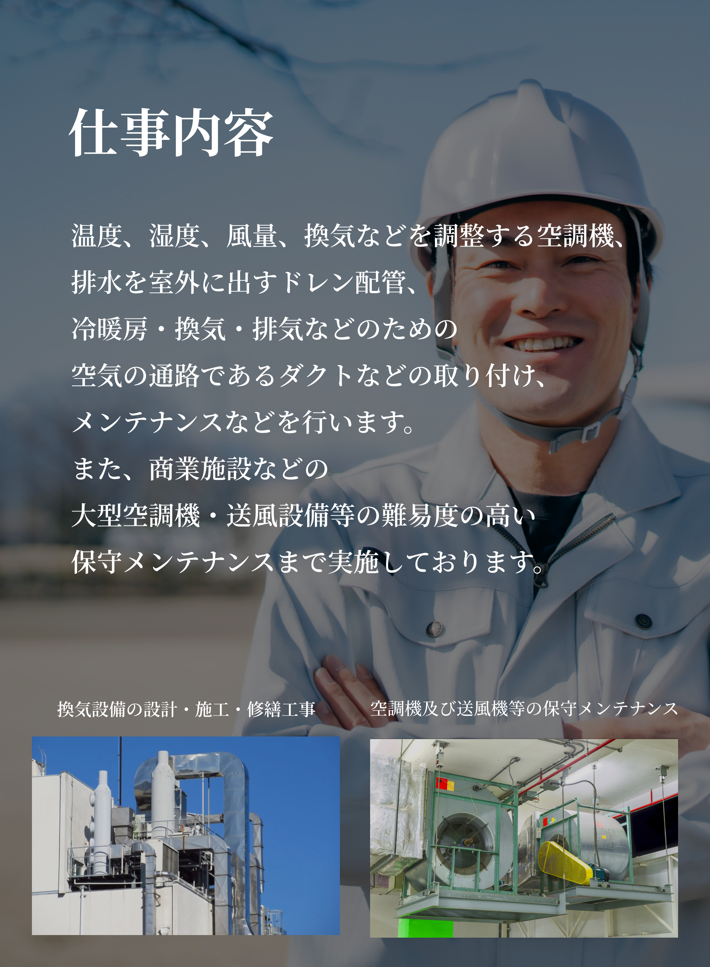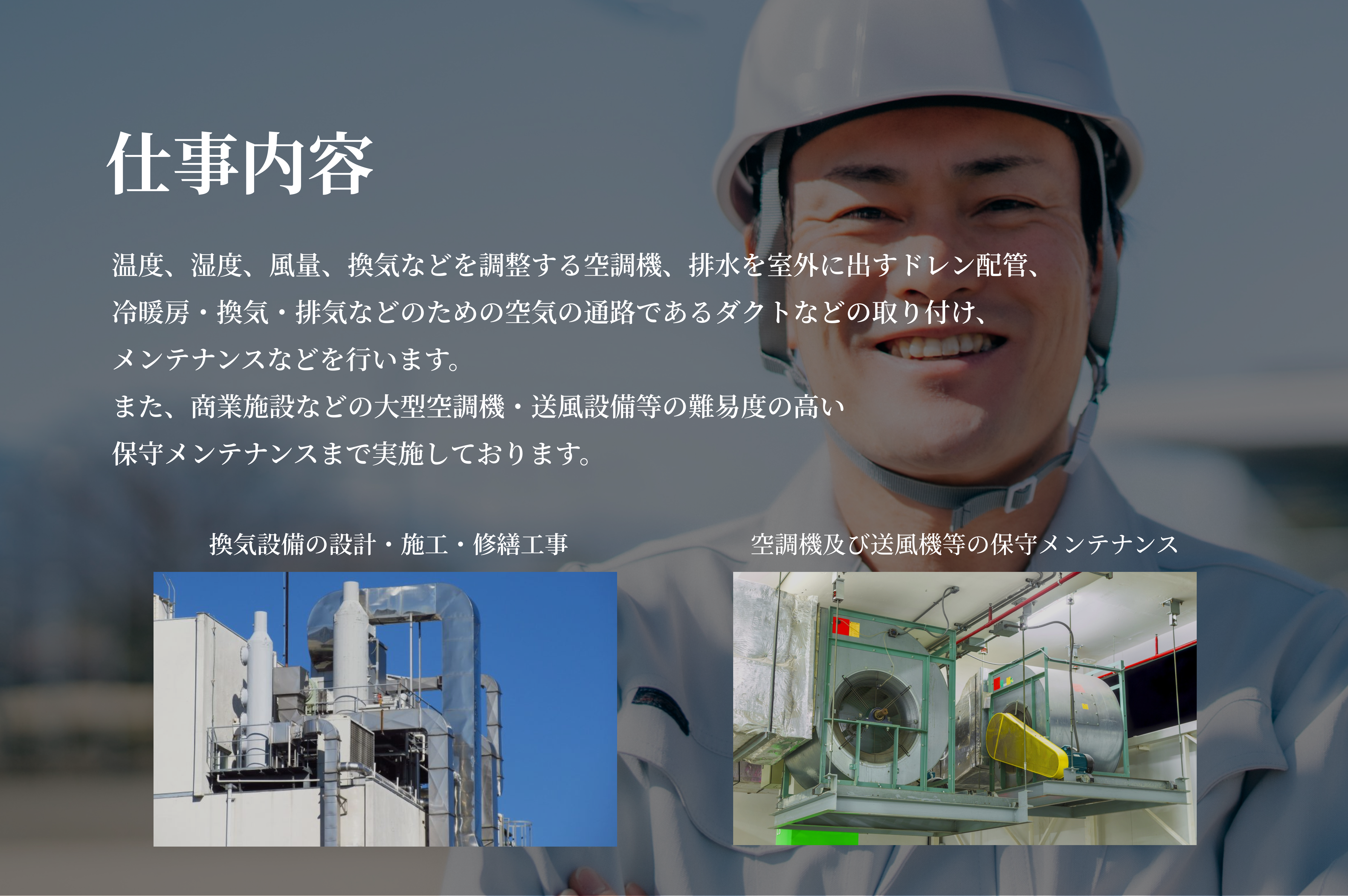 | 事業内容 | 換気設備の設計、施工、修繕工事業務 空調機及び送風機等の保守メンテナンス業務 |